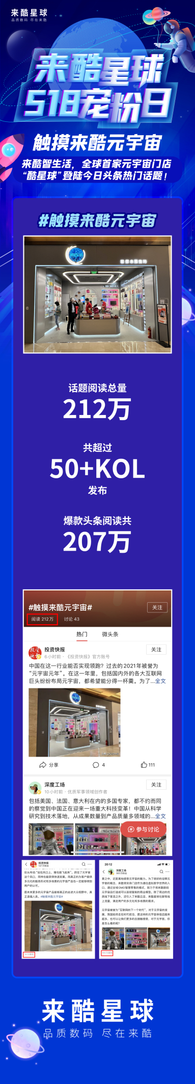 几年来,来酷科技始终致力于突破产业边界,通过数字经济赋能智慧零售产业进行转型升级。从最初建业时的传统零售门店,到2022年3月,高调发布元宇宙生态战略,强势进军元宇宙,与生态伙伴高效联动,重构来酷零售新生态。这也就意味着,在来酷星球,将会有越来越多的超级IP空降登陆,用全新的玩法为来酷元宇宙生态带来更多的用户体验。