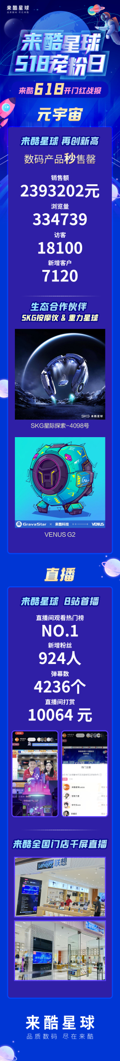 来酷成军于2017年岁末,是一家专注于3C+品质潮品的智慧零售连锁企业,历经四年市场磨砺,来酷通过新概念的进化、新物种的迭代,已将其业务场景扩展至包括个人办公、游戏电竞、益智教育、智能健康等七大领域,拥有全国270万会员及私域粉丝,388家门店,44家分销和零售合作伙伴参股,并在福建搭建了较为健全的合伙人体系。如今,来酷线下免税店、机场店、SPM店、校园店等多场景门店,线上到家、小时达、来酷云店等平台的OMO矩阵,已成功搭建起来酷完整的的智慧零售生态体系,多触点响应市场需求。可以毫不夸张地说,来酷用四年的时间创造了我国智慧零售的行业奇迹。这也让来酷在数码零售平台市场估值不断攀升的今天,不仅在拥挤的线上3C数码市场分得了一杯羹,更逐渐以赢收百亿的业绩、千亿的市场估值比肩3C数码零售巨头!