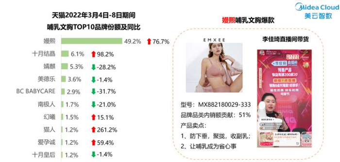 对品质的执着追求也成为嫚熙领跑行业的强劲动力。据星谋云数据显示,今年天猫3·8节活动期间,嫚熙销售总额破千万,同比提升76.5%,成为了唯一跻身内衣行业三甲的哺乳内衣品类品牌,同时在哺乳内衣品类的销额占比近50%,独领该赛道的半壁江山。