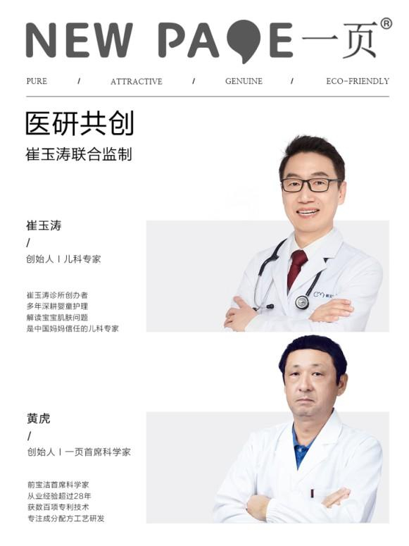 newpage一页由儿科专家崔玉涛和科学家黄虎博士联合创立,崔玉涛多年来深耕婴童护理、解读宝宝肌肤问题,是中国妈妈信任的儿科专家;黄虎博士拥有28年化妆品领域从业经验,曾任美国宝洁首席科学家,拥有数百项专利,精通新品开发、原料开发、配方和生产工艺等。两位创始人以“医研共创”的模式,打通用户需求、临床经验和科研技术,为用户提供真正安全有效的产品。
