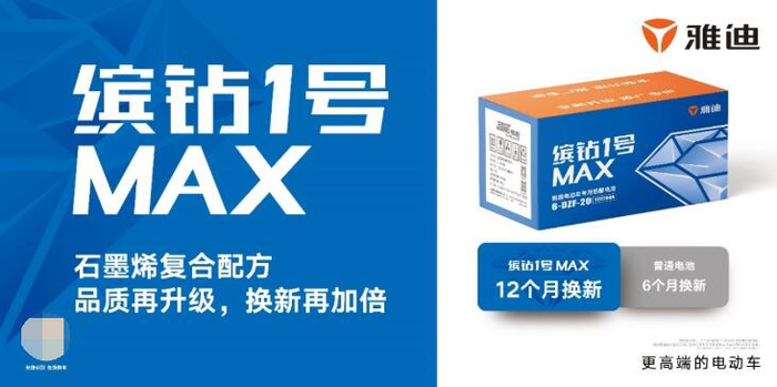 这次雅迪还特别将最新研发的“石墨烯复合配方”电池——缤钻1号MAX电池加入活动,用户只需在半价换原装电池的基础上加价100元,便可以升级换新雅迪缤钻1号MAX电池,获得行业最新的电池技术。