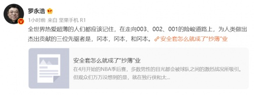 5月19日,罗永浩再次发微博点赞冈本,丝毫不吝赞美之词,“全世界热爱超薄的人们都应该记住,在走向003、002、001的险峻道路上,为人类做出杰出贡献的三位先驱者是,冈本,冈本,和冈本。”。