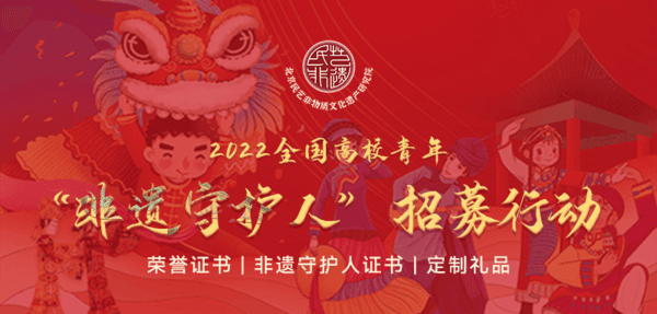为贯彻落实十九大全会精神,进一步提高青年大学生非物质文化遗产保护意识,传承、弘扬中华优秀传统文化,营造非遗保护的良好社会氛围,中国民协非物质文化遗产传播中心、北京民艺非遗研究院联合举办2022全国高校青年“非遗守护人”招募行动,旨在与青年大学生共同守护中国非遗文化,助力非遗保护!