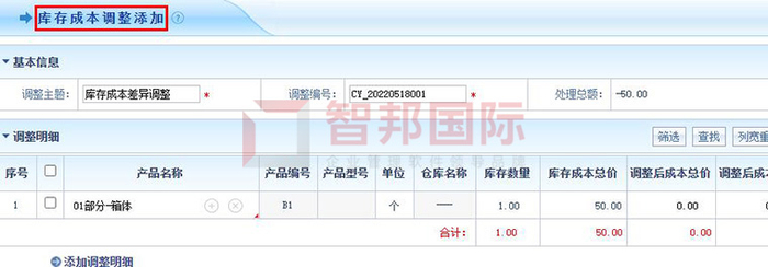 功能价值:智邦国际ERP系统32.04版本,新增可调式库存成本,从库存成本调整单添加到删除,从单据保存自动校验到重复数据高亮提示,从成本核算取消,调整单自动删除,到调整单自动对接生成财务凭证,并可自定义凭证模板等,功能一应俱全,库存成本校正全流程,又快又准!