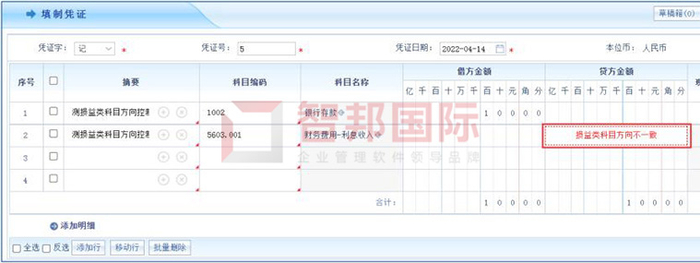 功能价值:智邦国际ERP系统32.04版本,新增预警式凭证提醒,凭证添加、修改、对接模板设置时,自动控制损益类科目发生额方向与科目方向一致,如果不一致,凭证保存时,自动红字高亮预警提醒“损益类科目方向不一致”,避免财务数据错误发生,做账精准高效。