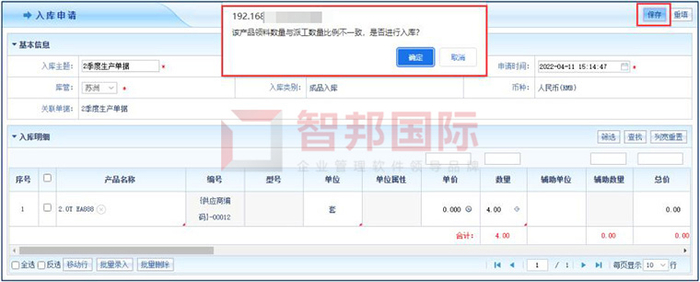 功能价值:智邦国际ERP系统32.04版本,新增齐套式物料入库检测,半成品、产成品入库时,自动校验入库父件数量与子件领料出库数量是否成套,未达到比例数量时,自动弹框温馨提示,避免线下已领料、线上未同步导致账实不符、数据混乱等,更减少人工犯错几率,精细化管理每个物料进出数据。