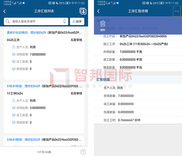 功能价值:智邦国际ERP系统32.04版本,APP端新增工序汇报删除,在工序汇报详情页,一键点击“删除”,即可确认并删除该条详情,让线下、线上、PC端、APP端等各场景工序汇报数据保持一致,生产进度、数量、质量等更精准更可控,大幅提升订单交付率。