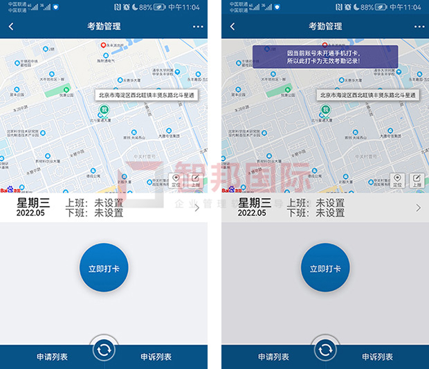 功能价值:智邦国际ERP系统32.04版本,APP端新增考勤打卡温馨提示语,当考勤人员的考勤方式没有勾选手机时,点击打卡后,自动出现“因当前账号未开通手机打卡,所以此打卡为无效考勤记录……”提示语,及时、明确又兼具人性化,避免考勤人员误操作,大幅提升考勤数据正确性和员工满意度。