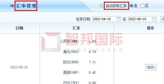 功能价值:智邦国际ERP系统32.04版本,新增自动式汇率获取,一键选择“自动获取汇率”策略,系统自动获取央行发布的当日汇率中间价;如遇节假日,还可自动继承上一工作日汇率;并可自动刷新获取时间前的汇率,全方位避免汇率数据失误,更大幅提高财务效率。