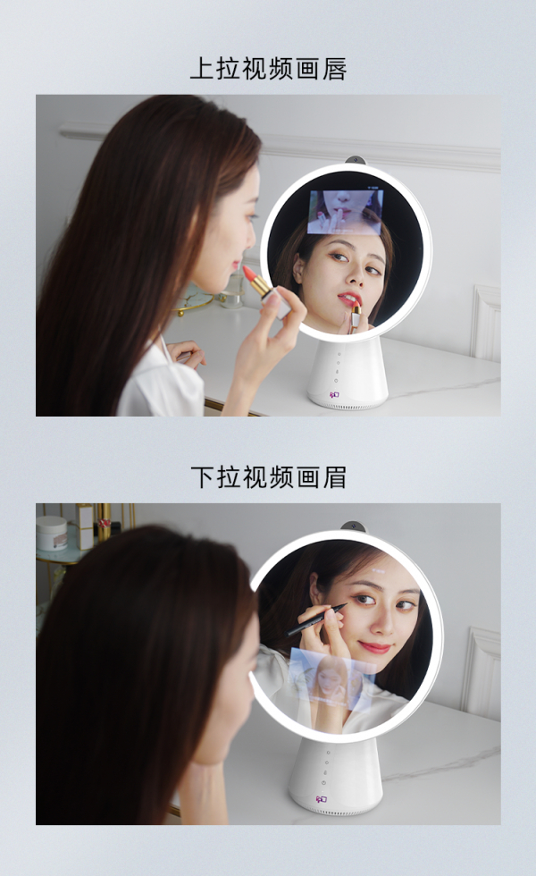 镜子中的8英寸触摸显示屏搭载Android智能操作系统,内置了FPD很多深度定制的APP,美妆云课堂堪称所有女生专属美妆大师,独家美妆、美肤、美容操视频、图文教程。想画唇,打开唇妆视频,视频窗口移动至顶端,不挡住镜面;画眼妆,视频窗口移动至底部,分屏模式边看边练习,轻松上手明星款妆容。