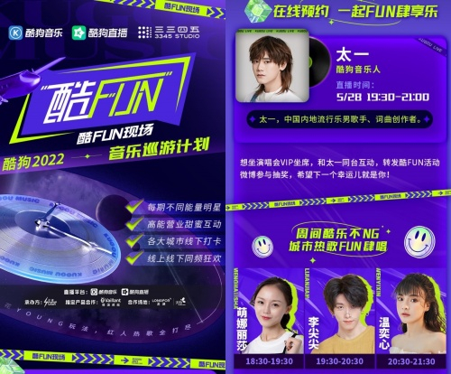 酷FUN现场——酷狗2022音乐巡游计划,由酷狗音乐、酷狗直播,以及腾讯音乐娱乐集团三三四五工作室共同举办。作为《酷狗首唱会》全新的线下演出品牌,酷FUN现场围绕“音乐”这一主题,以线下音乐会为载体,打造一次集结红人红歌的“线上+线下”LIVE巡演计划。2022年,“酷FUN现场”计划前往全国各大城市地标、网红打卡点及热门商圈等潮流阵地,全方位打造顶级演唱会现场,以沉浸式的演出和零距离互动体验,拓展粉丝与爱豆之间的多元联动模式,探寻音乐现场的更多可能性。