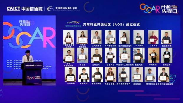 为推动汽车行业开源技术进步,促进汽车行业形成健康可持续的开源发展生态,由中国信息通信研究院联合中电科拟态安全、武汉路特斯、上汽乘用车、上汽通用五菱汽车、合众新能源、极氪汽车、一汽解放、零束科技、长城汽车、江淮汽车、吉利汽车研究院、比亚迪、江铃汽车、小鹏汽车、中国汽车工程研究院、潍柴动力、奕行智能、寰福科技、博泰车联网、湖北亿咖通、航盛电子、摩斯智联、厦门雅迅、沙龙机甲组成的中国信通院汽车行业开源社区在本届“OSCAR开源先锋日”上举行了成立仪式。