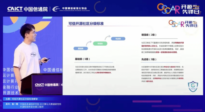 为帮助国内开源项目完善社区治理与运营,中国信通院云大所开源和软件安全部工程师张一阳现场对了《可信开源社区分级标准》进行了深度解读。