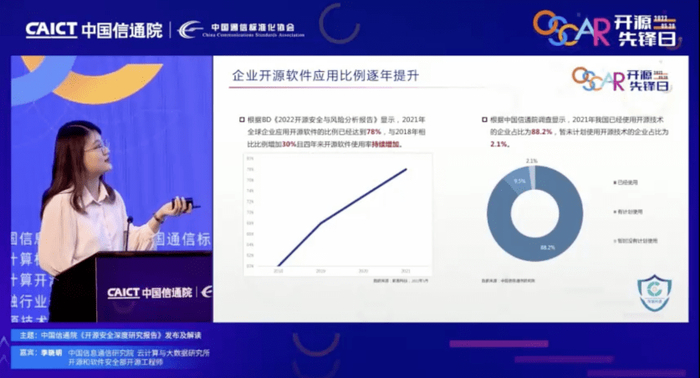 为了让企业安全的使用开源软件,更好应对开源安全风险,中国信通院云大所开源和软件安全部工程师李晓明在会上解读了由中国信通院牵头,中国建设银行、建信金科等国内知名企业共同参与编制的《开源安全深度研究报告》。
