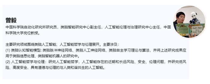 曾毅:我主要的研究领域围绕类脑人工智能展开,具体讲是受脑在不同尺度的结构与机制启发,构建具有生物合理性和计算可行性的类脑智能,终极目标是实现在认知能力上可以比拟甚至是超越人脑的,但仍与人能和谐相处,有道德、合乎伦理的类脑人工智能。这是我的终生科学追求,我的实验室已经为此付出了10年的努力,并将持续再用几十年的时间研制具备这样能力的类脑认知智能引擎(Brain-inspired Cognitive Intelligence Engine),贡献于人与人工智能的和谐共生。