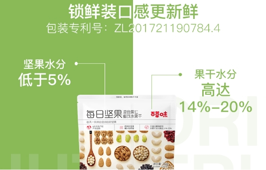 众所周知,果干和坚果对含水量的要求并不相同,若将果干和坚果混装,会相互影响口感和营养。2018年,为了解决果干跟坚果混合后水分游移影响坚果口感、容易滋生霉菌的行业痛点,百草味在行业首创了干湿分离的“锁鲜装”技术,通过内置的锁鲜条,即保障了果干口感更加甜润,也让坚果仁口感更加香脆,产品品质更加稳定。百草味的“锁鲜装”推出后,不仅取得了国家专利,还斩获多项行业大奖。
