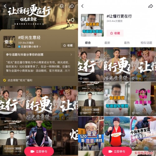 为了助力中小商家成长,帮助其实现生意新可能,520宠爱季期间,巨量引擎联合中国中小商业企业协会上线“炬光”第三期「让懂行更在行」,联合三家自助客户拍摄炬光故事,十多家中小商家发起#炬光生意经 话题。面向全国中小商家,鼓励小而不凡的商家。同时开放百亿流量活动,开放炬光宝典公开课,提供1v1店铺咨询服务,让更多的炬光商家发挥所长,在巨量引擎做好生意,从懂行到更在行。