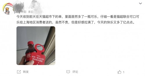 随着越来越多的商家复工,消费者网购越来越便利。天猫方面回应,上海疫情发生至今,众多消费者坚持选择天猫超市订购生活物资,此次“偷偷”往上海消费者包裹里放可乐,是对大家的一次致谢,“侬好上海”,感谢上海消费者的信任与陪伴。