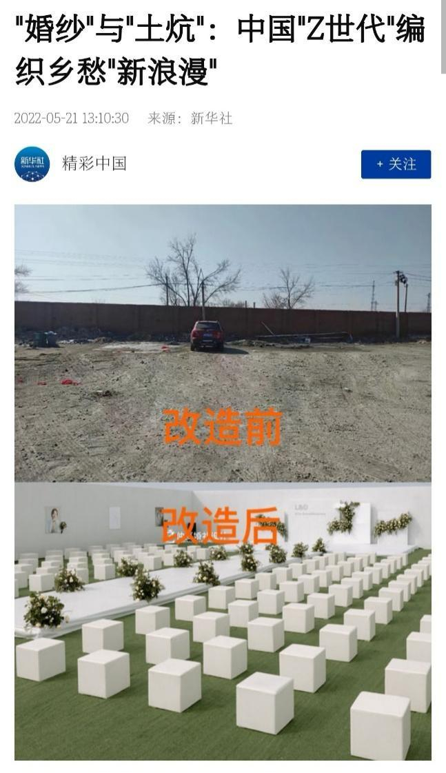 谁说农村婚礼就意味着“土气”?现在不少年轻人回农村结婚,选择上小红书“查攻略”,办一场“洋气”的DIY“草坪婚礼”,并把经验分享给更多人,这已经成为最新时尚。新华社5月21日在《“婚纱”与“土炕”:中国“Z世代”编织乡愁“新浪漫”》报道中指出,如今,不少在城市打拼,相遇相爱的“Z世代”青年选择回到农村老家完成人生中最重要的形式。他们自己动手DIY,办起了仪式感满满的“新时髦”婚礼,蕴含着婚纱与土炕,城市与乡愁,传统与现代并存的文化元素,成为中国农村新风尚。