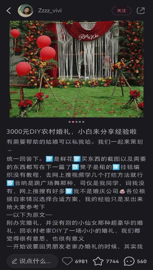 博主Zzzz_vivi就在小红书晒出了自己的农村婚礼。从丈量场地、草图设计、到婚礼现场调度指挥,张女士和老公全程DIY,把自己的婚礼“操办成了艺术品”。她的小红书笔记至今已被30多万人观看,很多人留言表示自己婚礼也要“抄作业”。