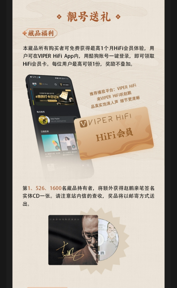 本次藏品限量发布1600份,定价66元,5月23日起,歌迷即可进入酷狗数字藏品页面预约,5月26日17:00正式发售。值得一提的是,基于数字藏品的技术属性,《低音诗人·谜》的每张Hi-Fi藏品均含有平台唯一序列号,为歌迷打造独一无二的专属收藏。同时,藏品附有三版赵鹏的亲笔签名定制封面,第1、526、1600名藏品持有者,还将额外获得赵鹏亲笔签名实体CD一张,稀缺性显而易见。为了反馈所有喜爱赵鹏的歌迷,酷狗为每一位购买者送出最高1个月的HiFi会员体验,歌迷登陆Viper Hifi App,用酷狗账号一键登录,即可领取Hifi会员卡,细品真实饱满人声。