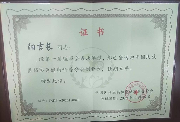 2022年5月,在杭州隆重召开的第四届中医药民族医药健康科普大会上,谷医堂(湖南)健康科技有限公司荣膺“中国民族医药协会健康科普分会副会长单位”,谷医堂创始人、董事长兼总裁阳吉长荣耀当选中国民族医药协会健康科普分会副会长。