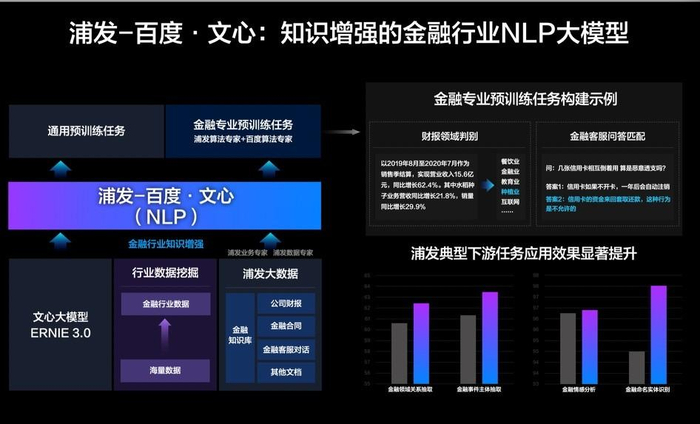 相似的思路,在金融领域,百度和浦发研发了浦发-百度·文心大模型。基于通用文心大模型挖掘金融行业数据,结合浦发场景积累的行业数据与知识,双方技术和业务专家一起设计了针对性的财报领域判别、金融客服问答匹配等预训练任务,让文心大模型学习到金融行业的知识,在浦发典型任务应用效果显著提升。