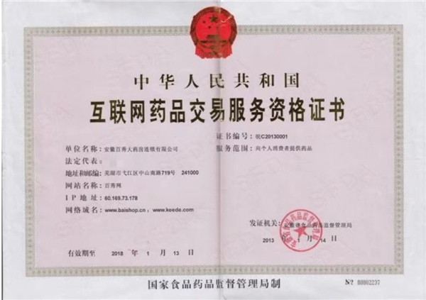 但其实早在2013年1月14日就有一家医药连锁企业——安徽百秀大药房有限公司获得《互联网药品交易服务资格证书》