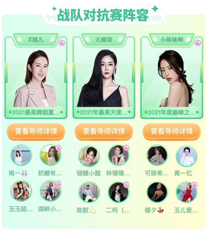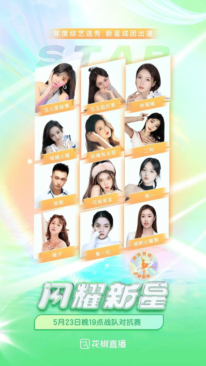 5月23日晚19:00,Z嫣儿、天蝎柒、小师妹啊三位导师将率麾下最中意的四位主播亮相官方6666房间,在战队对抗赛短兵相接!更刺激的PK规划,更残酷的晋级方式,更热烈的投票玩法,将与大家一起见证“闪耀新星”荣誉加身!