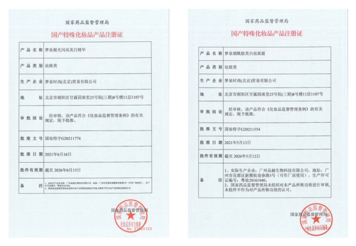 梦泉极光闪亮美白精华和梦泉烟酰胺美白祛斑霜特证