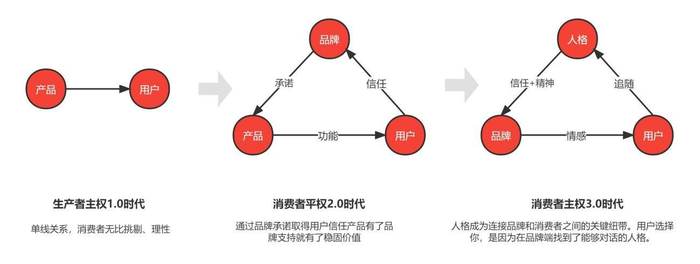 在过去生产者主权时代,企业与用户是单线触达,单向关系非黑即白,用户无比理性充满了挑剔。后来随着国民整体经济水平提升,市场供需趋于稳定,消费者希望获得更多尊重可以被平等对待,于是消费平权时代带来,形成了“产品、用户、品牌”三者相互影响的三角关系,产品有了品牌支撑就有了稳固的价值。而在后品牌时代,商品产能过剩及严重同质化造成了消费端掌握了极大主动权,在消费者主权的交易市场,品牌需要主动站出来拉拢客户,才能赢得消费者的精神投票。所以新的三角关系诞生,人格成为连接品牌和消费者之间的关键纽带。个人品牌的火爆及其商业结果验证说明消费者的决策方式发生了根本性变化,人格和情绪成为新的决策主导。用户愿意支持你包容你,是因为在品牌端找到了能够对话的人格,并且成为了与品牌三观一致的自己人。