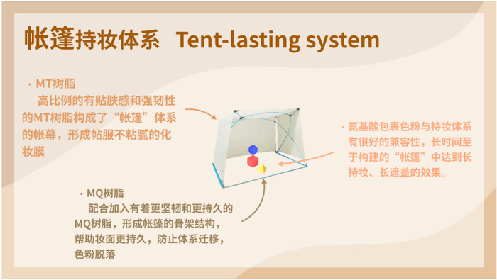 通过研究,COSMAX 粉底研发团队掌握了独特的“帐篷型”持妆技术,将软硬膜相互配合,做到既耐摩擦,又有韧性,打造可以持久锁妆的粉底液。通过这一技术,我们能够使色粉牢牢锁在网络结构之下,有效对抗迁移,在皮肤上形成一层防水防汗、坚韧不易斑驳的网状化妆膜。