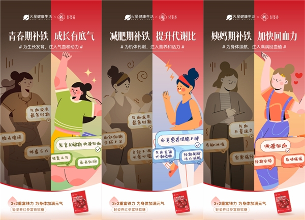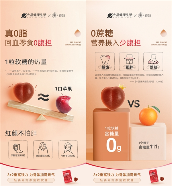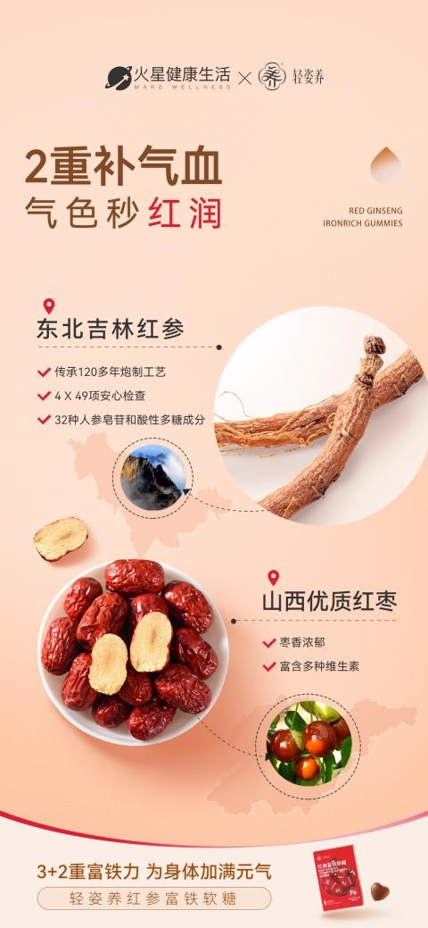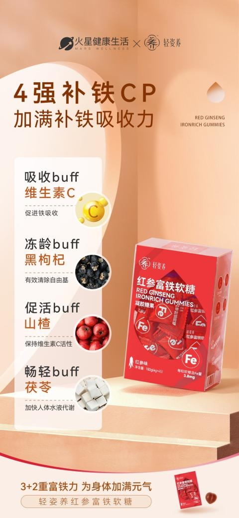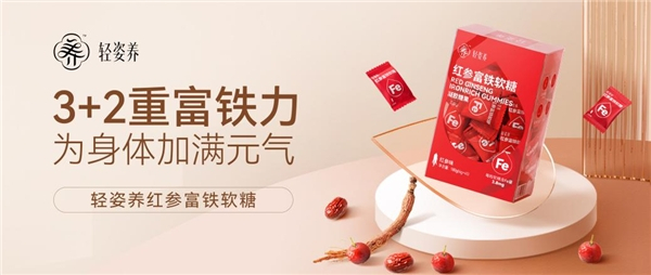 作为一个年轻的大健康战略品牌,轻姿养持续关注健康领域、积极布局大健康产业地图,新品红参富铁软糖以3+2重富铁力突破性实现气血双补,不仅满足了人们补充气血的需求,软糖形式更加适合当今的年轻化市场。