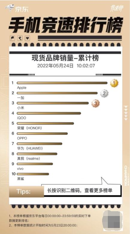 近几年,一加凭借极致性价比的产品赢得了许多消费者的青睐,一加10 Pro凭借全新一代骁龙8移动平台+LPDDR5+UFS 3.1性能铁三角,以及立体空间散热系统,被众多网友称为“机皇”,拿下了京东手机现货单品销量累计榜冠军。iQOO Neo5 SE、iQOO Z5、OPPO K9 Pro、iPhone 13则拿下第二到第五位置。在现货品牌销量累计榜中,Apple获第一,一加凭借一加10 Pro、一加9RT的优异表现拿下了亚军,小米获得季军。iQ00、荣耀、OPPO、华为、realme、vivo、黑鲨则包揽了TOP10其余位置。