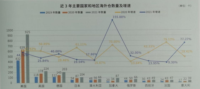 据跨境眼观察与中国邮政联合发布的《2022海外仓蓝皮书》介绍,截至2021年12月,海外仓数量排名前十的国家为美国、英国、德国、日本、澳大利亚、加拿大、俄罗斯、西班牙、法国、意大利,总数达1810个。从整体趋势看,2020年,美、英、日、加、西、法6个国家的海外仓数量增速均超过40%;2021年,海外仓增速有所放缓,仅有美、德、加、意4国海外仓增速超过40%。其中,加拿大以155.88%的增速领跑,意大利的增速排名第二,为77.27%,美国则以44.76%的增速排名第三。美国海外仓在2020年的高基数下依旧增长迅猛。由于2021年中国-美西港口海运头程异常拥堵,为确保顺利入库,大量服务商转到美东航线,并开始在美东区域布局海外仓。同时,也说明美国作为中国卖家的主要市场,海外仓需求高涨。