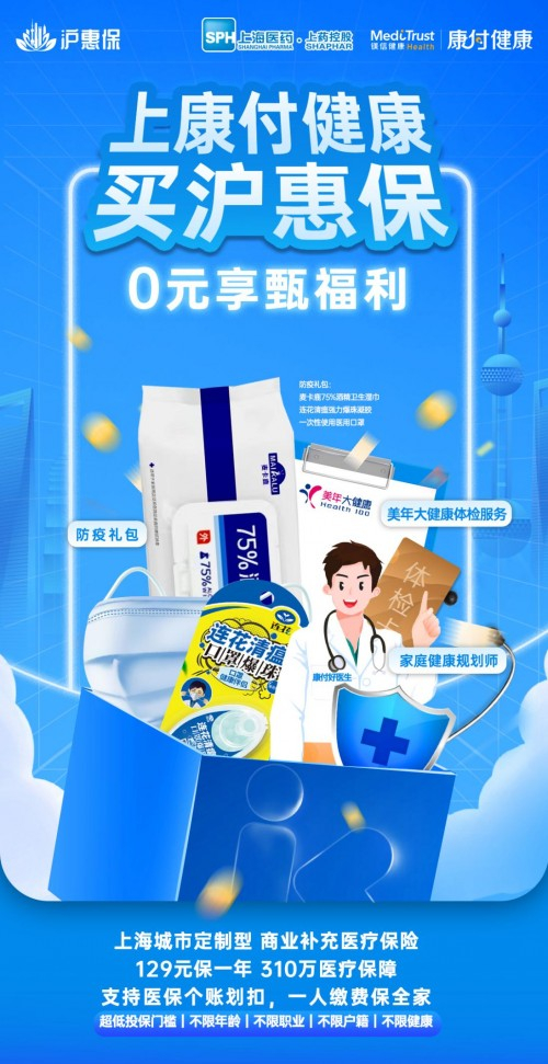 凡通过上药控股·镁信健康旗下汇聚医疗福利和品质健康服务的创新平台“康付健康”平台购买“沪惠保”的参保人,即可额外免费获得“甄福利”大礼包,全面覆盖生活各个方面:(1) 防疫礼包:内含酒精湿巾、医用口罩、连花清瘟强力爆珠凝胶等防疫用品,家庭必备,共克时艰;(2)“健康规划师”:为用户提供“常见病咨询”“慢性病咨询”“季节流感咨询”“体检报告解读”“就医指导”等在线咨询服务,医生在线指导,守护全家健康;(3)孝心疾病早筛:60周岁以上老年人可在全国领先的健康检测机构美年大健康享受心脑血管类疾病的深度体检,检查项目包括经颅多谱勒或动脉硬化检查,规避风险隐患,远离慢性重病;(4)自我关爱早筛:享受全面的体检服务,及时发现早期疾病或调整亚健康状态,更好地实现健康管理,充分考虑不同年龄段人群的不同需求。