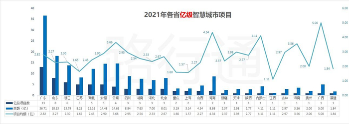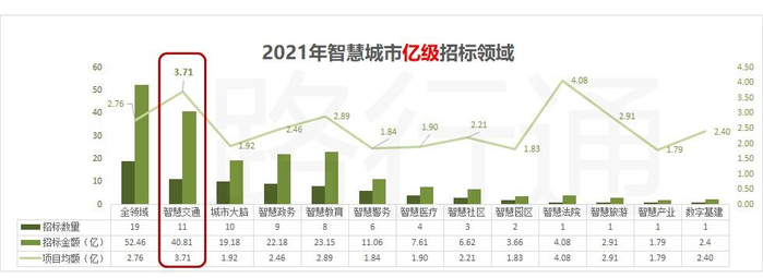 2021年来看,就已有25个省或直辖市发布了76个过亿的智慧城市项目中标公告。除了智慧城市全领域整体项目之外,在过亿的细分领域中,智慧交通以14%的数量占比、21%的总金额占比依然持续抢眼,也呈现出智慧交通投资以投资项目多、单笔投资额大为特点。