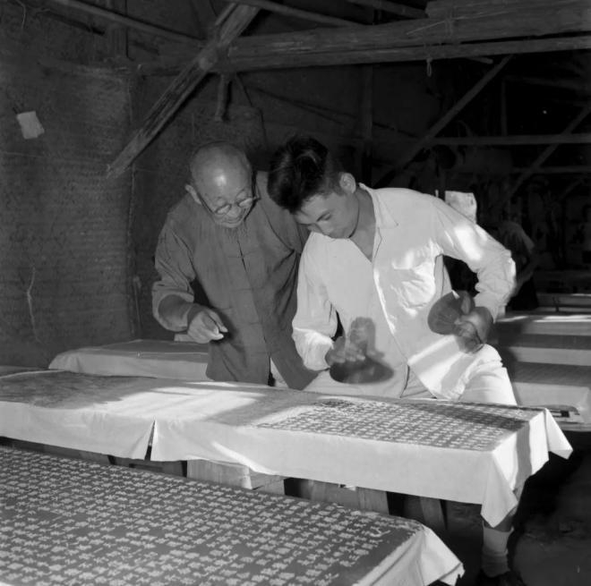 这张照片是1957年专家黄炳章整理房山石经时的情景。1956年至1958年经国务院批准,中国佛教协会对房山石经进行了全面发掘整理和拓印。照片上看拓片的专家是黄炳章先生,是他发现了记载辽金石经埋藏方位的重要碑记。