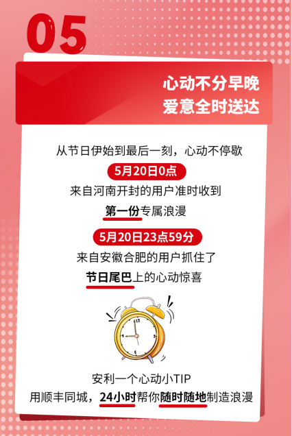 而在520这样特殊的日子,无论什么时候下单,不少消费者都希望鲜花、礼物能够快速准时送达,即便是深夜,对服务时间和精准度上有着更高的要求。以顺丰同城披露的数据为例,从凌晨到夜晚24小时,都有鲜花蛋糕等礼物不断在配送。最早的一单便精确在0:00分,掐点准时送达。