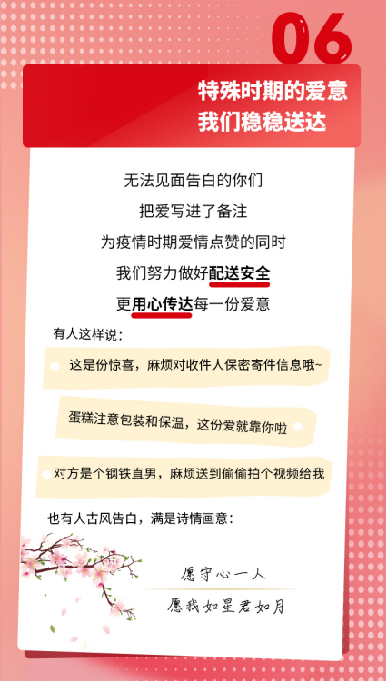 这是今年520许多情侣的写照,疫情影响下,见面真的很难,预定的各种浪漫计划都成了一场空,因为快递存在一定的时效差,无法保证礼物按时送达,因此,通过第三方即时配送平台为爱人急送一束鲜花、一份礼物,成为不少人表达爱意的首选。为此,骑士们在这一天为无数用户打响了一场异地爱情保卫战。