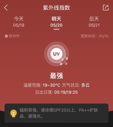 墨迹天气App端内紫外线指数预报,提供每日紫外线强度提醒,并贴心给出防紫外线建议,帮助避免在紫外线辐射最强的时间晒太阳或者外出,多多关注墨迹天气,一起做防晒小达人吧!
