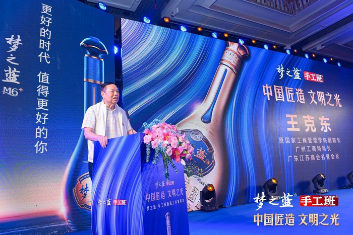 梦之蓝·手工班新品启动发布会仪式由江苏洋河酒厂股份有限公司总裁助理朱昭鑫、洋河股份广东事业部总经理姬正辉、广州酒类协会创会会长钟秉雄、原国家工商管理学院副院长、原广州工商局局长、广东江苏商会名誉会长王克东、广州绿盎贸易有限公司黄建山、广州飞融贸易有限公司总经理赵飞、广州南分公司经理付大伟、广州北分公司经理张文丰。上台开启新品的启动仪式;为梦之蓝·手工班高端酒的新品形象进入市场谱写新的篇章。