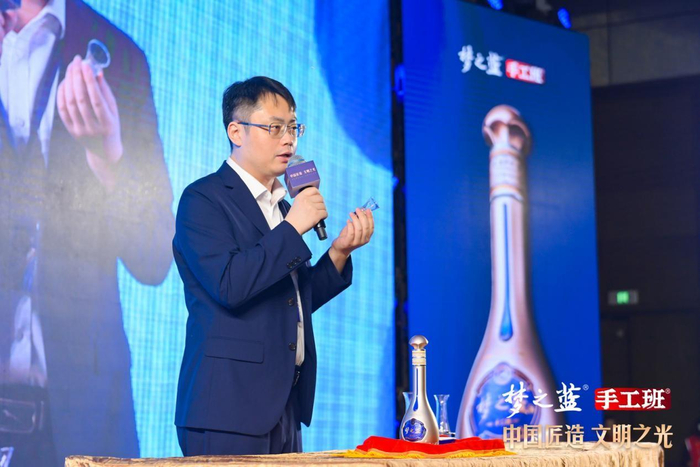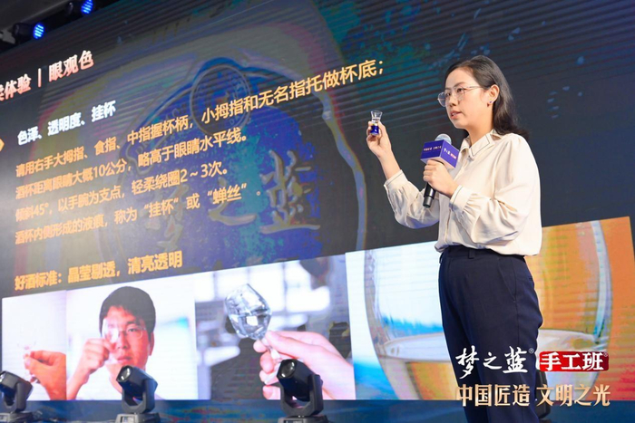 洋河大师工作室,全国品酒师大赛冠军田锐花上台梦之蓝·手工班做演讲推介。七个字总结它的特点:尊贵、稀缺、更好喝。尊贵取决于三个因素。第一个因素是“老窖”,手工班全部出自梦之蓝中央酒区的百年明清老窖。俗话说:千年老窖万年糟,酒好全凭窖池老。第二个因素是老酒,手工班选用的都是20年以上的老酒作为基酒。酒体经过20年的自然老熟,更平衡、更绵柔、更饱满。第三个因素是“老匠人”。手工班在传统三低工艺的基础上,采用的是非遗手酿技艺。每一滴酒体都需要经历137道手工工艺。明清老窖产的原酒经过层层筛选、优中取优只有15%才能符合手工班的品质要求。20年以上的特级老酒,20年的修炼雕琢,20年以上老匠人的精心打造,使得手工班喝起来更加醇厚、细腻、绵长。
