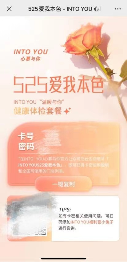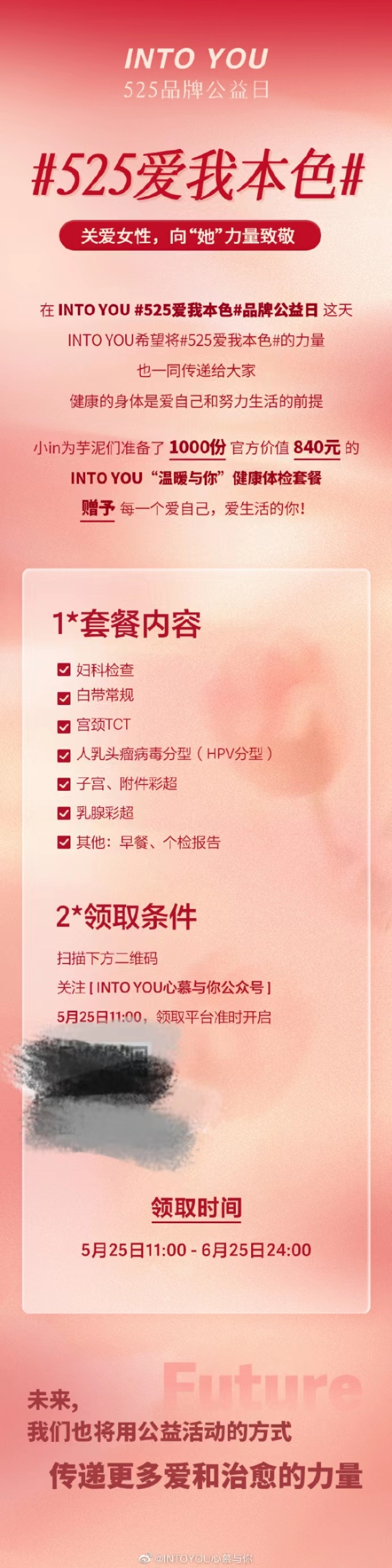 爱自己,更值得被爱。随着品牌公益日的到来,INTO YOU心慕与你还通过1000份女性健康体检套餐免费派送的形式,把实质的爱意给到女性群体,让她们能在被爱中尽情绽放。5月25日,关注INTO YOU官方微博、微信公众号,就有机会领取到INTO YOU派送的爱意。
