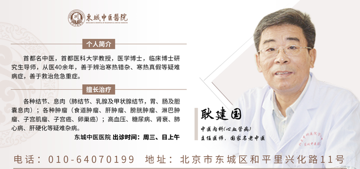 耿建国,主任医师,国家名老中医、首都名中医,东城中医医院特聘专家,每周三、周日上午出诊,首都医科大学教授,医学博士,临床博士研究生导师,从医40余年,善于辨治寒热错杂、寒热真假等疑难病症,善于救治危急重症。擅长治疗:各种结节、息肉(肺结节、乳腺及甲状腺结节,胃、肠及胆囊息肉);各种肿瘤(食道肿瘤、肝肿瘤、膀胱肿瘤、淋巴肿瘤、子宫肌瘤、子宫癌、卵巢癌);高血压、糖尿病、肾衰、肺心病、肝硬化等疑难杂病。