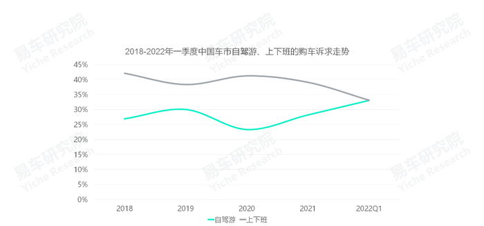 据易车研究院调研数据显示,2020-2022年一季度,中国车市的自驾游购车诉求开始触底反弹,由23.34%升至33.03%,快速逼近过去一直位居第一购车诉求的上下班。