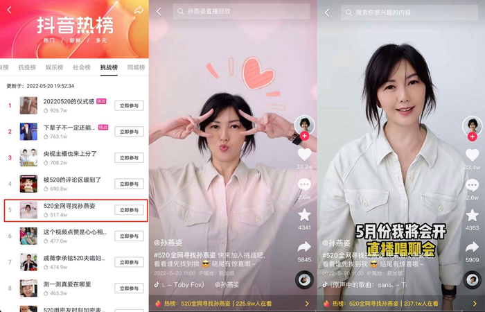 在520这天,孙燕姿给粉丝送上的最特别的告白礼物,发布短视频预告了将要举办抖音唱聊会的信息,让网友期待不已,并迅速带动视频相关话题#520全网寻找孙燕姿 登上了抖音热榜位置。