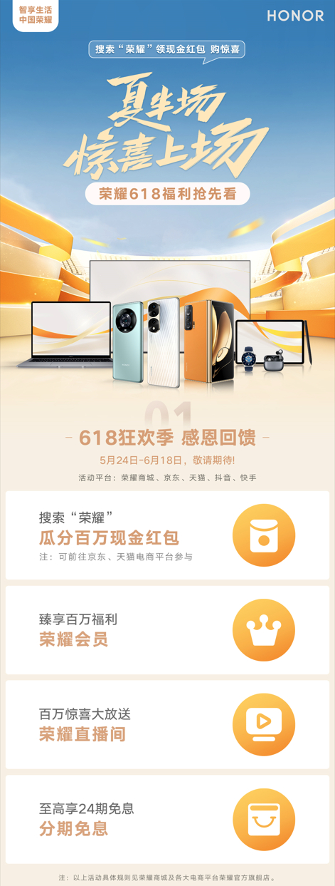 除了即将发布的荣耀70系列,此次618荣耀还有智慧屏、笔记本电脑、智能手表等新产品,为回报广大用户的陪伴与支持,荣耀在618期间推出多重惊喜感恩回馈用户——前往京东、天猫电商平台,搜索“荣耀”即可瓜分百万现金红包、荣耀会员臻享百万福利、荣耀直播间百万惊喜大放送、全系产品至高享24期分期免息等。