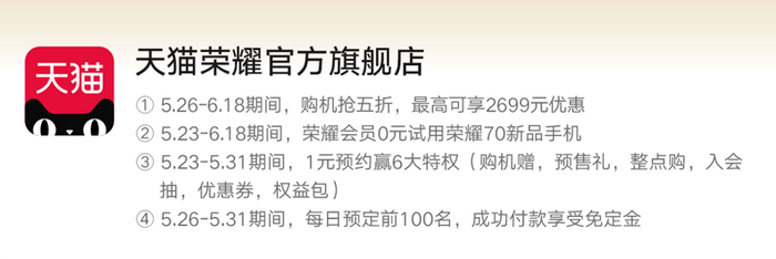 “先体验再购物”是感受荣耀创新的最佳方式。5.23-6.18期间,天猫荣耀官方旗舰店荣耀会员有机会0元试用荣耀70新品手机。另外,5.26-5.31期间每日预定前100名,成功付款享受免定金,机会多多。为生活增添科技与乐趣,来荣耀618就够了!