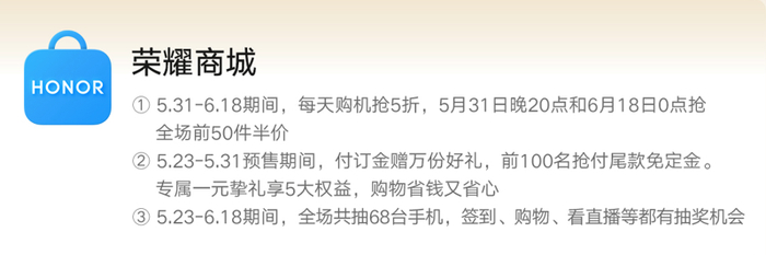 618剁手且慢!荣耀惊喜福利根本停不下来。5.31-6.18期间,荣耀商城每天购机抢5折。5.23-6.18期间,全场共抽68台手机,签到、购物、看直播等都有抽奖机会,几率大、渠道宽,抢到就是赚到!